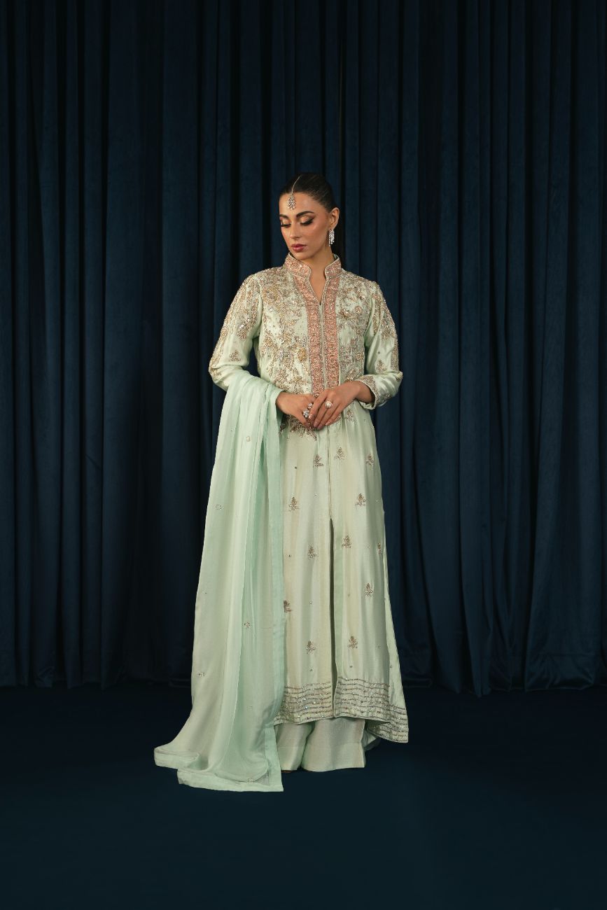 This gold tissue outfit is exquisitely adorned with intricate kora, dabka, nakshi, and sequin embellishments, creating a rich, opulent look. It is paired with straight pants and a pure chiffon dupatta, beautifully hand-embellished with mukesh for an added touch of elegance.